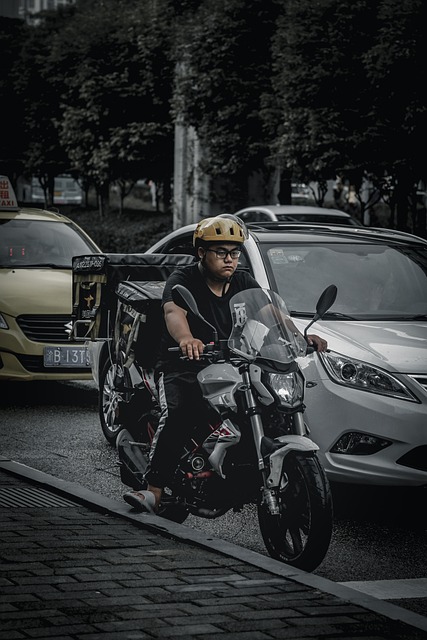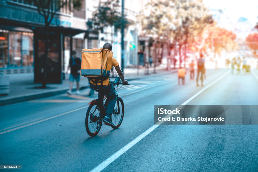 Bike Courier On City Street with delivery box on back
